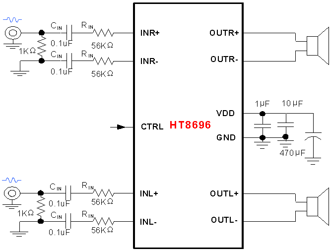 HT8696,7 features Anti-Clipping Function (ACF) which detects output signal clip due to the over input signal and suppresses the output signal clip automatically. Also the ACF function can adapt the output clip caused by power supply voltage down with battery. It can significantly improves the sound quality, creating a very comfortable musical enjoyment, and to protect the speakers from overload damage. It also supplies ACF OFF mode.